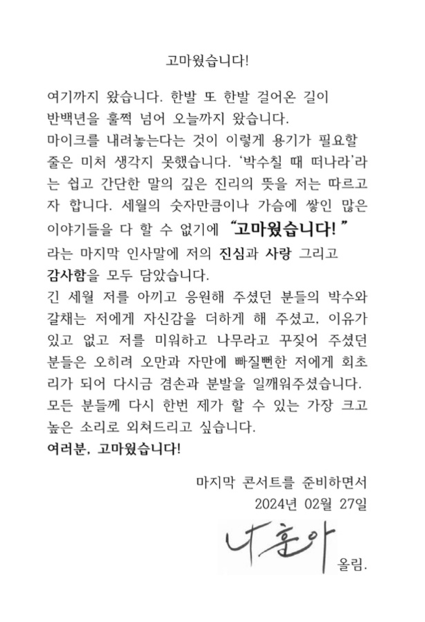 나훈아 님은 27일에 소속사를 통해 공개한 '고마웠습니다!' 라는 제목의 편지에서 "마이크를 내려놓는다는 것이 이렇게 용기가 필요할 줄은 미처 생각지 못했다"며 "박수칠 때 떠나라는 쉽고 간단한 말의 깊은 진리의 뜻을 저는 따르고자 한다"라고 적었습니다. 그리고 편지 마지막 끝에 '마지막 콘서트를 준비하면서'라는 문구를 추가해 이번 공연이 그의 마지막 무대임을 시사했습니다.